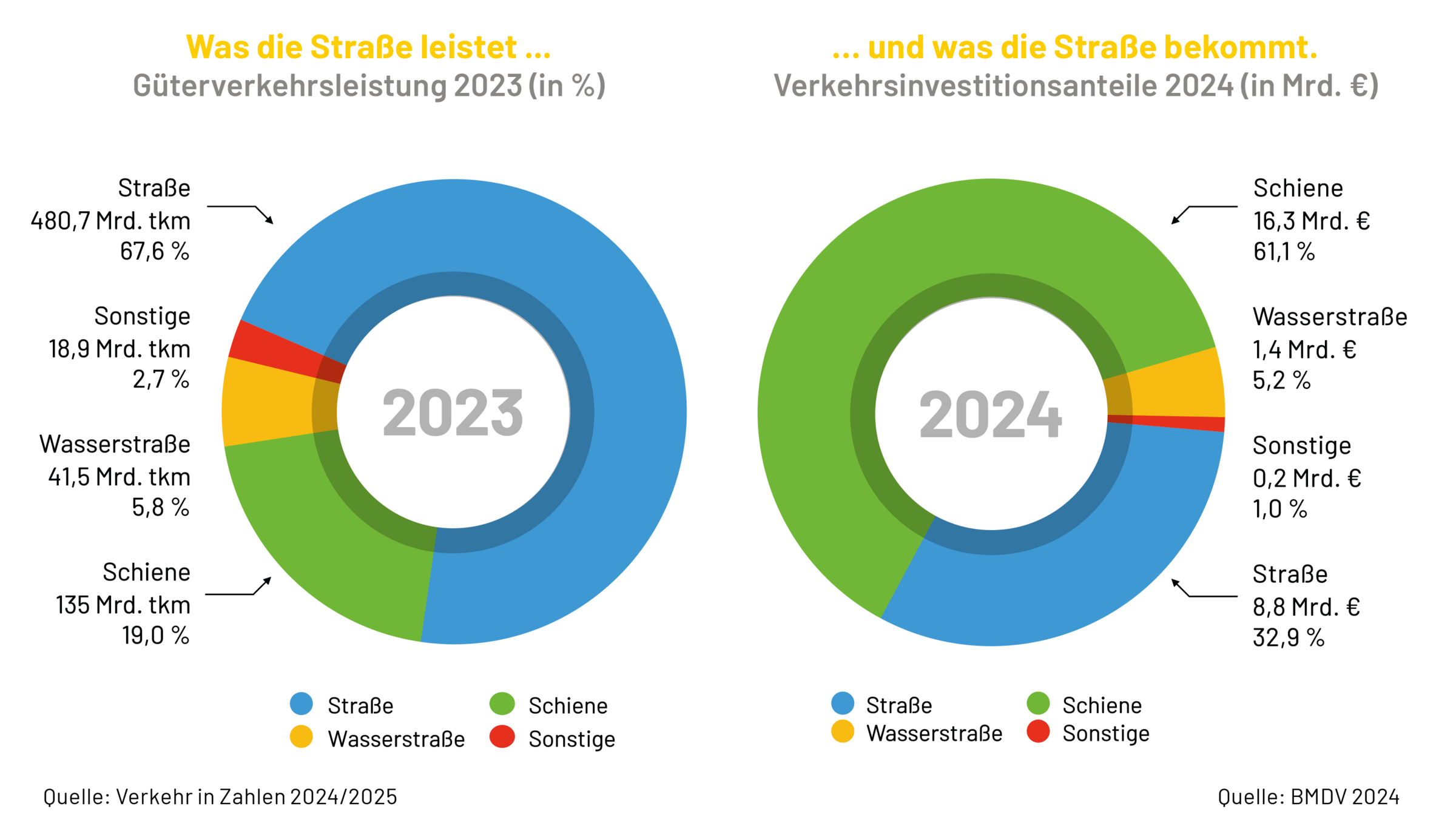 Für den Bereich der Straßenverkehrsinfrastruktur erscheinen potenzielle Einsparungen bei den Investitionsmitteln umso fragwürdiger. Vernachlässigt man die Eigenkapitalerhöhungen bei der Deutschen Bahn, werden nach der Einführung der CO2-Komponente bei der Lkw-Maut und der Ausweitung auf kleinere Nutzfahrzeuge etwa 80 Prozent aller Verkehrswegeinvestitionen des Bundes durch den Lkw bezahlt. Zusätzlich werden über die Energiesteuer für Kraftstoffe und die Kraftfahrzeugsteuer pro Jahr schon heute über 40 Milliarden Euro vom Straßenverkehr für allgemeine Zwecke im Bundeshaushalt beigesteuert. Und auch ein Vergleich zwischen der Güterverkehrsleistung und den Investitionsanteilen der einzelnen Verkehrsträger verdeutlicht, dass die volkswirtschaftliche Bedeutung des Verkehrsträgers Straße nicht ausreichend durch entsprechende Investitionen gewürdigt wird.