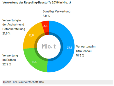 Im Jahr 2018 wurden in Deutschland insgesamt 73,3 Mio. t Recycling-Baustoffe produziert. Davon wurden 37,6 Mio. t (51,3 Prozent) im Straßenbau, 16,3 Mio. t (22,2 Prozent) im Erdbau und 3,6 Mio. t (4,9 Prozent) in sonstigen Anwendungen, überwiegend im Deponiebau, verwertet. 15,8 Mio. t (21,6 Prozent) wurden als Gesteinskörnung in der Asphalt- und Betonherstellung eingesetzt, wobei der mit Abstand größte Anteil davon auf den Einsatz im Asphalt entfiel.
